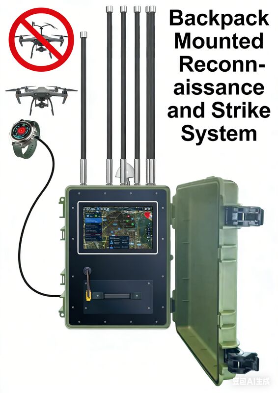 This wearable backpack-style drone reconnaissance and strike equipment features an innovative backpack design, enabling rapid deployment. Users can carry the device on their back and, through a series of efficient and convenient operations, put the drone into use in the shortest possible time. The device is lightweight and comfortable, allowing operators to maintain a high level of comfort and flexibility even during extended operations. Simultaneously, the backpack design allows users to easily carry and move the device, greatly improving mobility. Deployment requires only simple connection and operation to quickly unlock and deploy the drone for missions, meeting the needs for efficient and immediate reconnaissance and strike operations.
