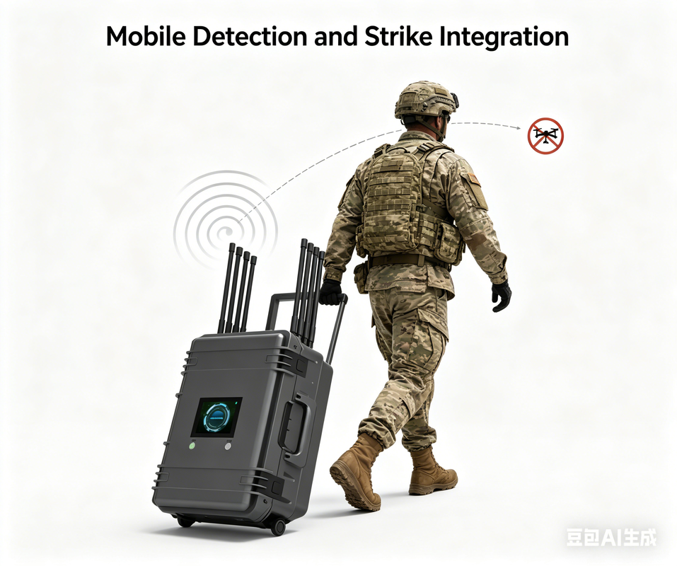 The "Mobile Counter-Drone Detection and Countermeasure System" is designed with convenient and rapid deployment as its core principle. The system is integrated into a rugged carrying case, with all equipment and components compactly stored within, making it both easy to carry and functional. This design allows the system to be quickly transferred and deployed in a short time, making it particularly suitable for battlefield, public safety, or other scenarios requiring immediate response. When faced with a drone threat, simply remove the system from the vehicle platform or storage case, quickly set it up at the designated location, and the system will immediately begin operating, without a complex installation process.