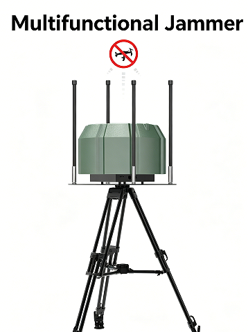 The 300MHz-6G Fixed UAV Signal Multi-Select Jamming Device is a high-performance integrated device capable of simultaneously performing signal detection and jamming. Utilizing advanced electronic and radio frequency technologies, it can monitor, detect, and effectively jam various frequency bands and signal types in real time. It integrates multiple functional modules, including signal reception, analysis, jamming, and positioning, enabling multiple UAV defense methods to be implemented on a single platform, improving ease of operation and effectiveness. The device's ingenious design allows for rapid identification and processing of signal threats from UAVs, effectively striking intrusion targets through precise jamming strategies.