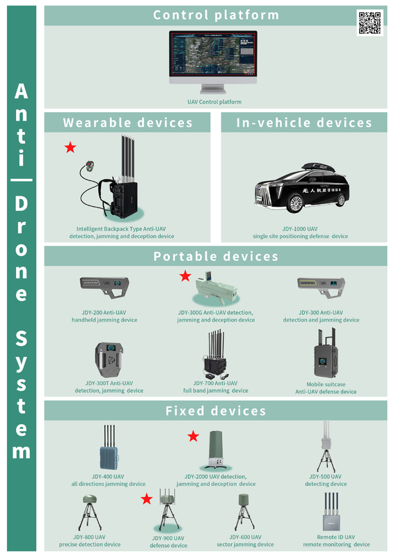 JDY-300G เป็นอุปกรณ์ตอบโต้อิเล็กทรอนิกส์แบบพกพาที่ออกแบบมาโดยเฉพาะสำหรับการป้องกันการบุกรุกเสียงพึมพำต่ำ โดยการส่งสัญญาณติดขัดที่แข็งแกร่งไปยังแถบการควบคุมและการส่งภาพที่ใช้กันทั่วไปโดยโดรนมันสามารถตัดการสื่อสารระหว่างเสียงพึมพำและผู้ปฏิบัติงานได้อย่างรวดเร็วทำให้มันสูญเสียความสามารถในการนำทาง